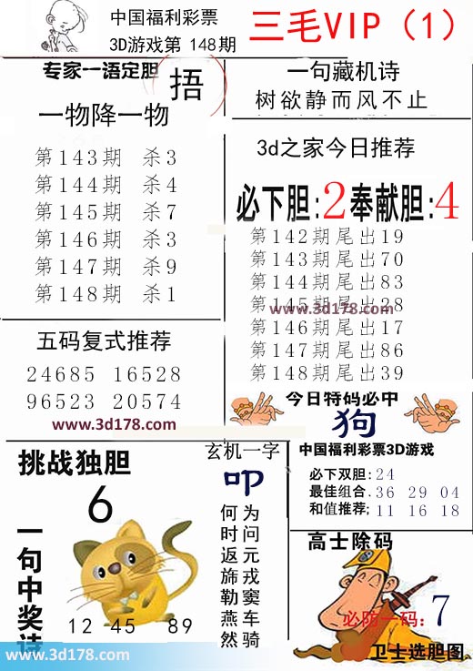 福彩3d第2018148期三毛VIP:3d第2018148期三毛VIP详解:一句藏机诗:树欲静而风不止第2018148期挑战独胆:6必下胆:2 奉献胆:4五码复式推荐:24685 16528 96523 20574今日特码必中:狗最佳组合:36 29 04 58和值推荐:11 16 18玄机一字:叩一句中奖诗:为问元戎窦车骑,何时返旆勒燕然该三毛玄机解码图由3d之家3d图库频道原创,仅供彩民参考,温馨提供。