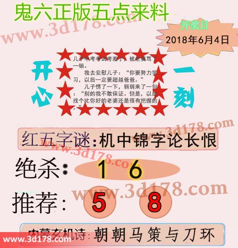 福彩3d第2018148期鬼六五点来料:3d鬼六五点来料详解第2018148期:红五字谜:机中锦字论长恨绝杀:1 6两胆码推荐:5 8内幕玄机诗:朝朝马策与刀环该鬼六图库由3d之家3d图库频道原创,仅供彩民参考,温馨提供。