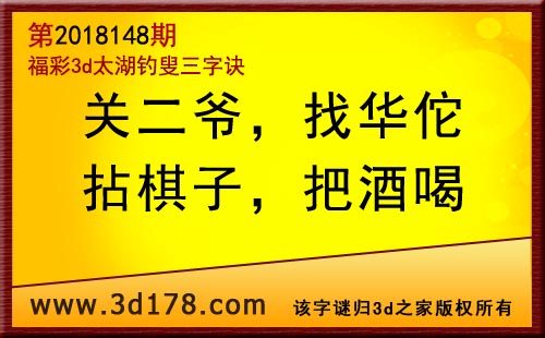 3d第18148期太湖字谜:关二爷,找华佗,拈棋子,把酒喝