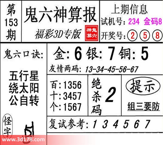 3d第18153期鬼六神算报为您推荐鬼六口诀:
