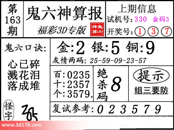 3d第18163期鬼六神算报为您推荐鬼六口诀: