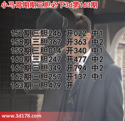 小马哥期期三胆必下163期推荐胆码:3d第18163期小马哥三胆预测如下:157期三胆246 开022 中1158期三胆367 开363 中2159期三胆014 开340 中1160期三胆247 开477 中2161期三胆349 开794 中2162期三胆257 开137 中1163期三胆479 开小马哥胆码图由3d之家3d图库频道原创,仅供彩民参考,温馨提供。