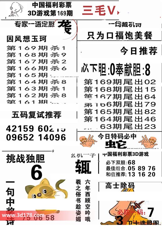 福彩3d第2018169期三毛VIP:3d第2018169期三毛VIP详解:一句藏机诗:只为口福饱美餐第2018169期挑战独胆:6必下胆:0 奉献胆:8五码复式推荐:42159 60215 09652 14096今日特码必中:蛇最佳组合:05 89 76和值推荐:13 16 20玄机一字:辄一句中奖诗:六年西顾空吟哦,羲之俗书趁姿媚该三毛玄机解码图由3d之家3d图库频道原创,仅供彩民参考,温馨提供。