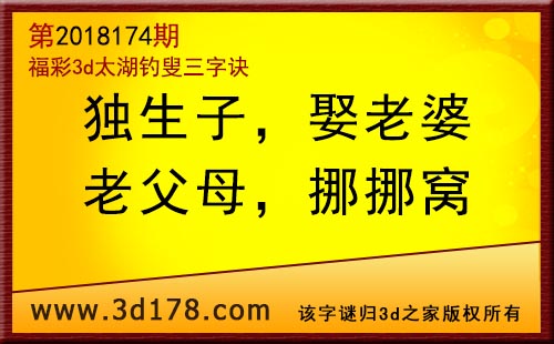 3d第18174期太湖字谜:独生子,娶老婆,老父母,挪挪窝