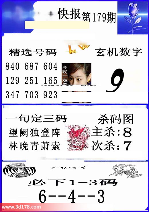 福彩3d凤凰快报图第18179期精选号码推荐:3d第2018179期凤凰快报内容解析:玄机数字:9精选号码:840 687 604 129 251 165 347 703 923一句定三码:望阙独登陴,林晚青萧索杀码图:主杀:8 次杀:7凤凰令:必下1-3码 6--4--3该凤凰快报图库由3d之家3d图库频道原创,仅供彩民参考,温馨提供。