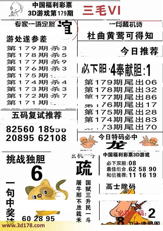 福彩3d第2018179期三毛VIP:3d第2018179期三毛VIP详解:一句藏机诗:杜曲黄莺可得知第2018179期挑战独胆:6必下胆:4 奉献胆:1五码复式推荐:82560 18956 20895 62108今日特码必中:龙最佳组合:62 58 90和值推荐:11 16 19玄机一字:疏一句中奖诗:国赋三升民一斗,屠牛那不胜栽禾该三毛玄机解码图由3d之家3d图库频道原创,仅供彩民参考,温馨提供。