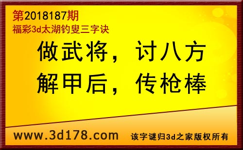3d第18187期太湖字谜:做武将,讨八方,解甲后,传枪棒