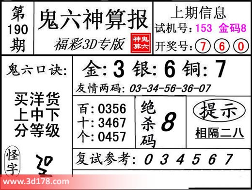 3d第18190期鬼六神算报为您推荐鬼六口诀: