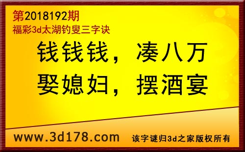 3d第18192期太湖字谜:钱钱钱,凑八万,娶媳妇,摆酒宴