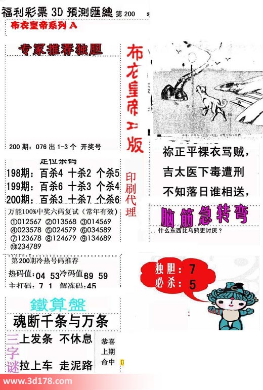 福彩3d第2018200期布衣皇帝A版布衣专家独家推荐: