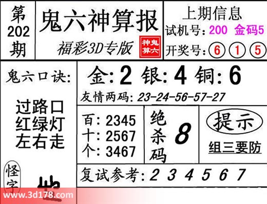 3d第18202期鬼六神算报为您推荐鬼六口诀: