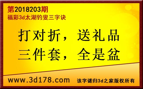 3d第18203期太湖字谜:打对折,送礼品,三件套,全是盆
