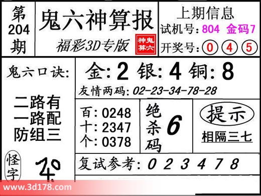3d第18204期鬼六神算报为您推荐鬼六口诀: