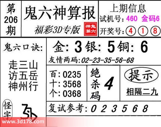 3d第18206期鬼六神算报为您推荐鬼六口诀:
