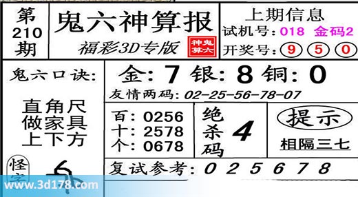 3d第18210期鬼六神算报为您推荐鬼六口诀: