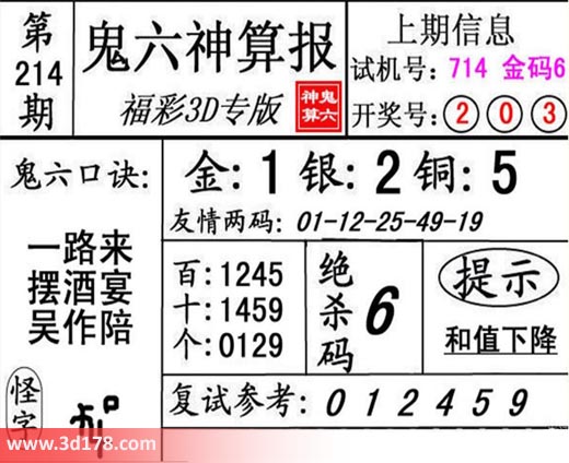 3d第18214期鬼六神算报为您推荐鬼六口诀:
