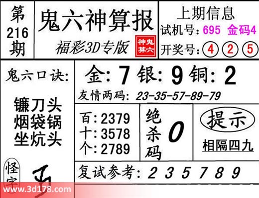 3d第18216期鬼六神算报为您推荐鬼六口诀: