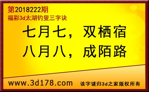 3d第18222期太湖字谜:七月七,双栖宿,八月八,成陌路