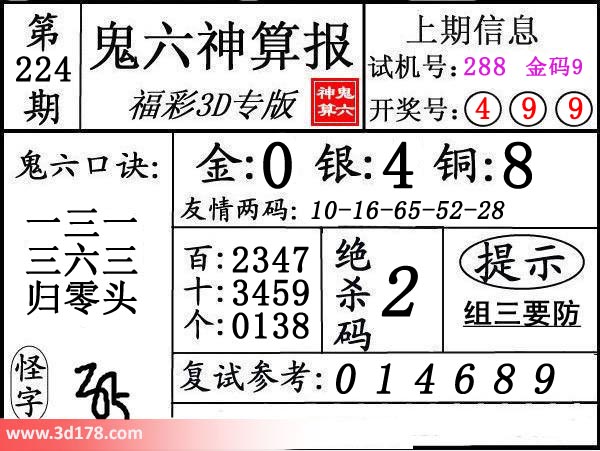3d第18224期鬼六神算报为您推荐鬼六口诀:
