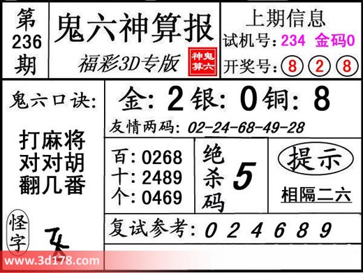 3d第18236期鬼六神算报为您推荐鬼六口诀: