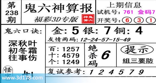 3d第18238期鬼六神算报为您推荐鬼六口诀: