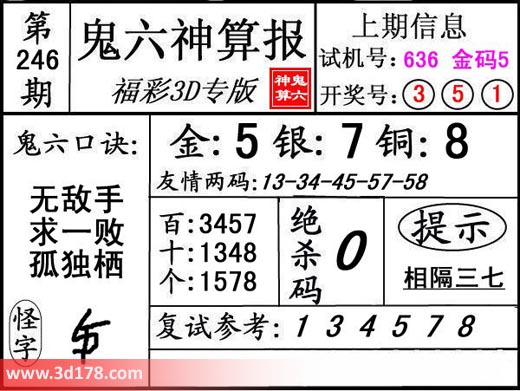 3d第18246期鬼六神算报为您推荐鬼六口诀: