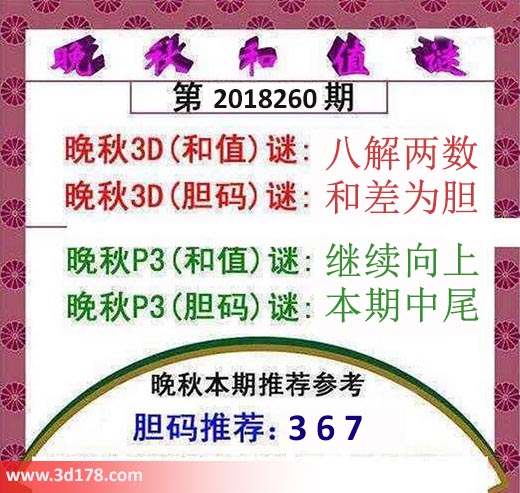 晚秋3D(和值)谜:八解两数