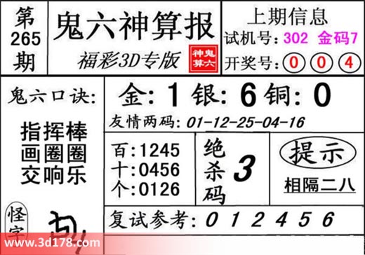 3d第18265期鬼六神算报为您推荐鬼六口诀: