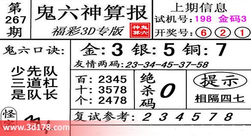 3d第18267期鬼六神算报为您推荐鬼六口诀: