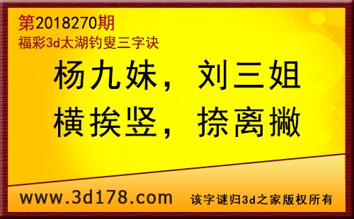 3d第18270期太湖字谜:杨九妹,刘三姐,横挨竖,捺离撇