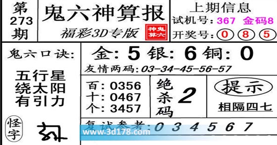 3d第18273期鬼六神算报为您推荐鬼六口诀:
