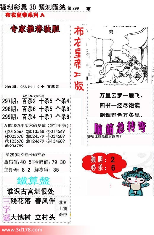 福彩3d第2018299期布衣皇帝A版布衣专家独家推荐: