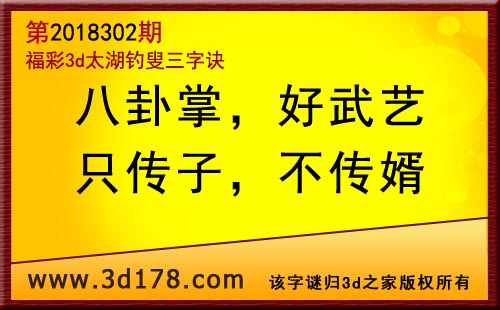 3d第182302期太湖字谜:八卦掌,好武艺,只传子,不传婿