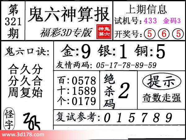3d第18321期鬼六神算报为您推荐鬼六口诀:
