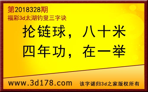 3d第18328期太湖字谜:抡链球,八十米,四年功,在一举