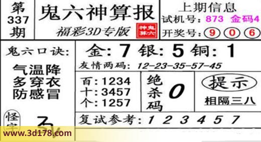 3d第18337期鬼六神算报为您推荐鬼六口诀:
