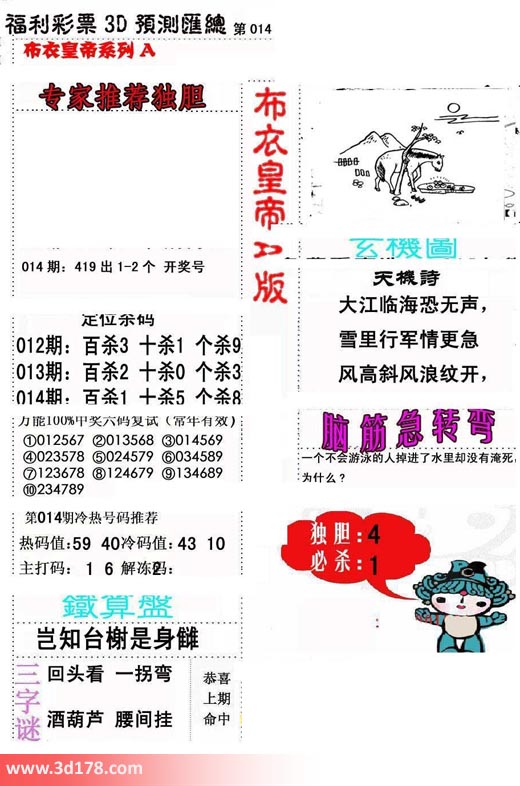 福彩3d第2019014期布衣皇帝A版布衣专家独家推荐: