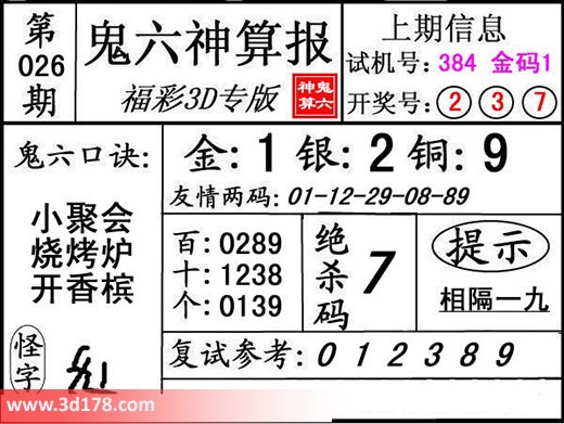 3d第19026期鬼六神算报为您推荐鬼六口诀: