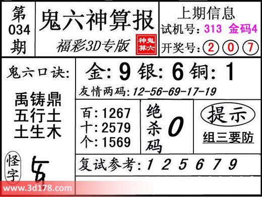 3d第19034期鬼六神算报为您推荐鬼六口诀: