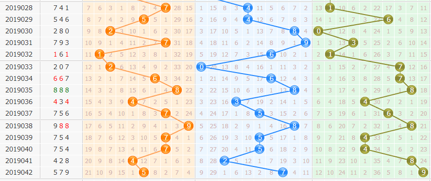 个位分析:040期-042期个位依次开出4、8、9,从012路特征来看,依次为1路、2路、0路数值,结合多期的号码轨迹分析,19043期建议防范个位码落于1路区间。