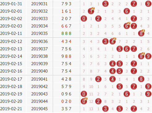 组选分析:在组选分布图上,小号0-2上期断开,本期防1-2枚;中部号码3-6上期开出2枚,本期关注1-2枚;大号7-9上期开出1枚,本期关注0-1枚;结合组选复隔中分布图,上期开出组选复复中形态,本期关注中码最少开出1-2枚。本期出号条件:复隔码02357=1-2枚,中码14689=1-2枚。