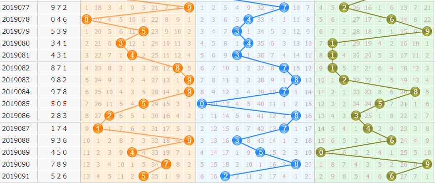 2. 和值大小:近10期和值大小比4:6,小数和值近30期占优,本期防大数和值。