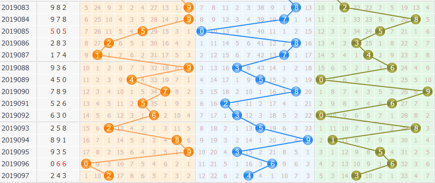 2. 和值大小:近10期和值大小比5:5,小数和值近30期占优,本期防大数和值。