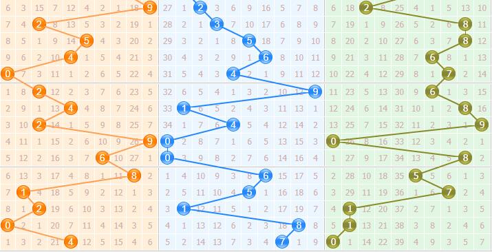 和值分析:上期和值11点,和值上升走势,近期和值走势波动较大,本期重点和值关注13防21点。