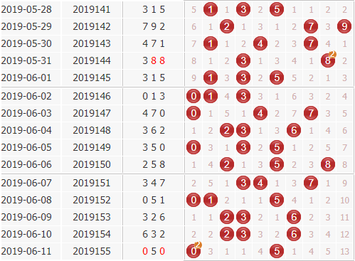 胆码分析:上期开奖号050,下期关注数字3,防数字4 8。