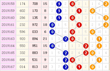 百位近10期012路分别开出3枚、3枚,4枚,0路减少,1路保持,2路增加; 百位2路号码近期占优,本期百位关注号码13459;