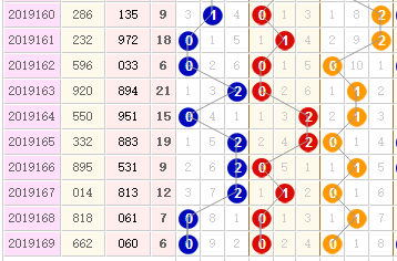 十位近10期012路分别开出5枚、2枚、3枚,0路增加,1路减少,2路保持; 十位0路号码近期占优,本期十位关注号码03459;
