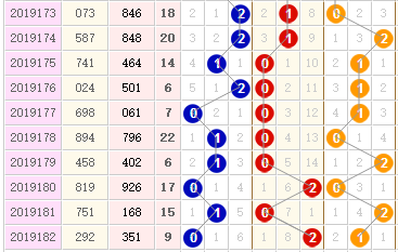 十位近10期012路分别开出6枚、2枚、2枚,0路保持,1路减少,2路增加; 十位0路号码近期占优,本期十位关注号码04678;