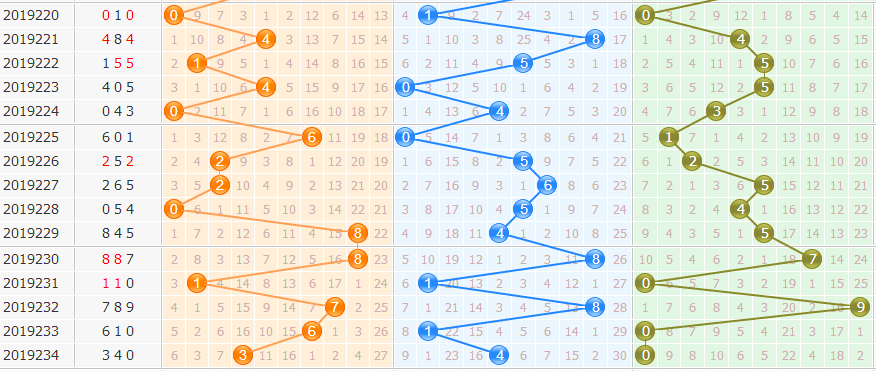 4. 和值012路:0、2路和值近10期短缺,2路和值近30期短缺,本期关注0、2路和值。
