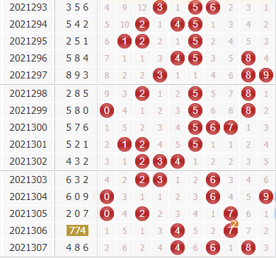 福彩3D第2021307期奖号为:486,分析最近20期组选号码发现,在组选0-9分布图中: